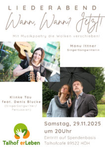 SingerSongwriterin Manu Ittner ist die einfühlsame Stimme hinter klangvollen Texten mit Tiefgang. In ihren eigenen Kompositionen verbindet sie Sprachkunst mit musikalischer Sensibilität und formt daraus Lieder voller Wärme und Ausdruckskraft. Mit Lust am Wortspiel und einem feinen Gespür für das Poetische erfindet sie Begriffe, erträumt Texte zwischen Sehnsucht, Aufbruch und Lebensfreude – stets mit einem Augenzwinkern. […]